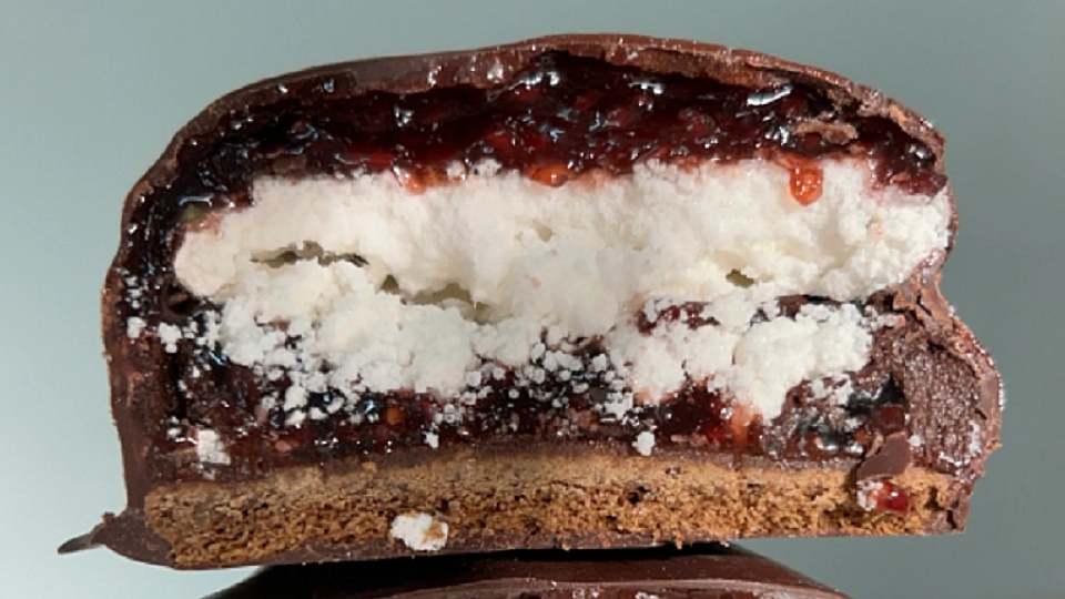 Alfajor con cobertura de chocolate negro al 70%, con frambuesas liofilizadas, ganache semi amargo, merengue y volcán de frambuesa.