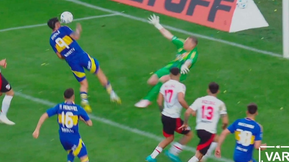 La voz de locución indica que Nicolás Ramírez, juez principal del Superclásico, no alcanzó a ver con claridad que el atacante del Xeneize había definido con la mano. El apoyo del VAR fue necesario para que, junto con los reclamos de los jugadores de River, el árbitro fuera a revisar la jugada en detalle.