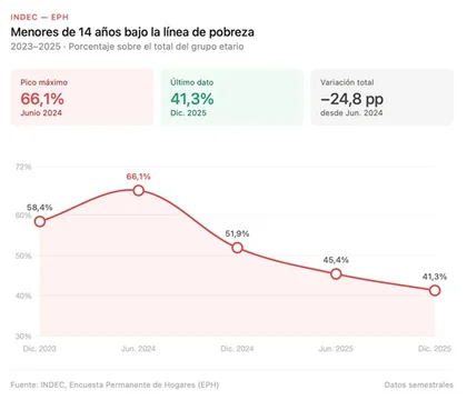 La Fundación Libertad y Progreso, de orientación liberal que dirigen Agustín Etchebarne, Manuel Solanet y Aldo Abram, puso de relieve que la pobreza entre los menores de 14 años en Argentina descendió 24,8 puntos porcentuales desde el máximo de 66,1% registrado en junio de 2024, mostrando una baja sostenida hasta llegar al 41,3% en diciembre de 2025.