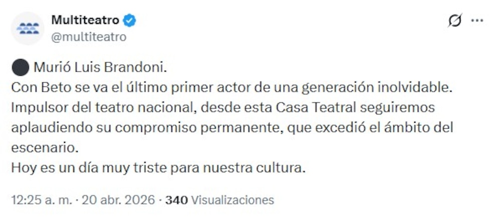 Al irse, deja una huella profunda en la cultura, el gremialismo y la vida pública del país. La triste noticia la confirmó Carlos Rottemberg: "Murió Luis Brandoni. Con Beto se va el último primer actor de una generación inolvidable. Impulsor del teatro nacional, desde esta Casa Teatral seguiremos aplaudiendo su compromiso permanente, que excedió el ámbito del escenario. Hoy es un día muy triste para nuestra cultura".