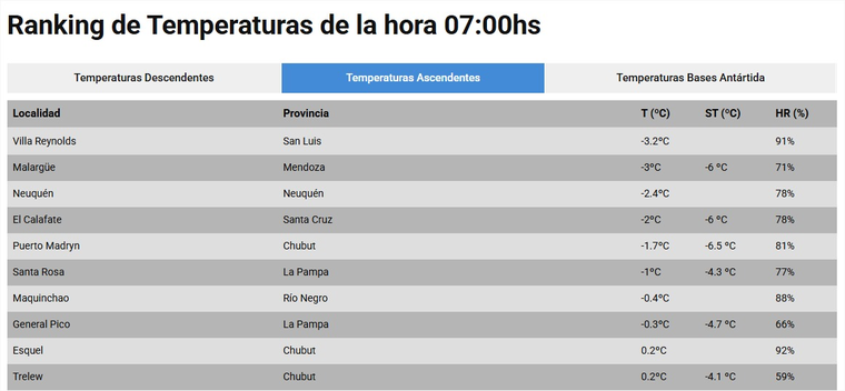 A continuación, el listado de las localidades que lideraron el ranking de temperaturas mínimas: