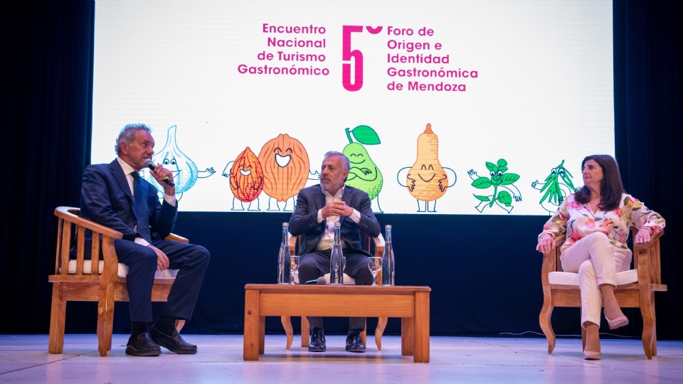 El Gobernador Alfredo Cornejo participó del 5° Foro de Origen e Identidad Gastronómica y el Encuentro Nacional de Turismo Gastronómico, compartiendo su exposición con el secretario de Turismo, Ambiente y Deporte de la Nación, Daniel Scioli, y la presidenta del Ente Mendoza Turismo (Emetur), Gabriela Testa.