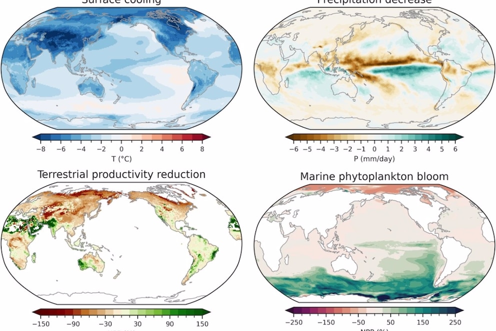 Y agregaron: "Se proyecta que tras un posible impacto, las temperaturas medias globales caerán 4 °C y las precipitaciones globales disminuirán un 15%. Las mayores reducciones relativas en la productividad primaria neta global terrestre y marina alcanzan el 36 y el 25 %, respectivamente".