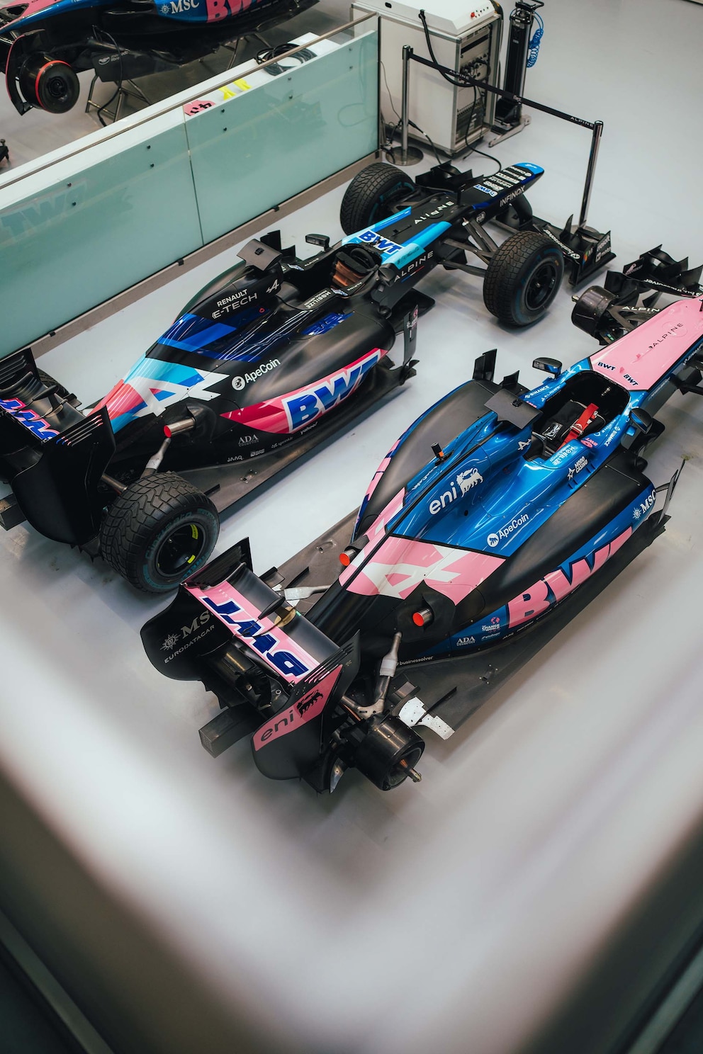 En la antesala de la sede de Alpine, donde se encuentran la recepción y la entrada para el personal, se exhiben dos réplicas que unen el pasado con el presente. Una corresponde a un coche emblemático: el R25 de 2005. Ese año, cuando la denominación de la escudería era Renault F1 Team, el equipo ganó la competencia de pilotos y la de constructores, de la mano de Fernando Alonso y Giancarlo Fisichella. La otra representa a un Alpine A522 del año 2022, cuando los pilotos eran Alonso y Esteban Ocon. Se trata de un coche de características similares al actual monoposto con el que compiten Colapinto y Pierre Gasly.