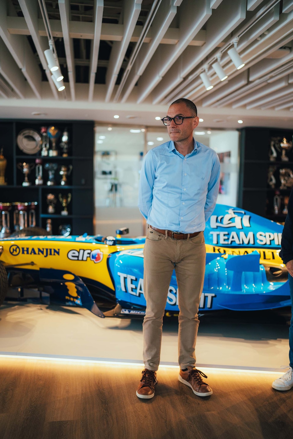 David Sánchez, Director Técnico Ejecutivo de Alpine. Detrás, la réplica del R25 con el que Fernando Alonso se consagró campeón en 2005