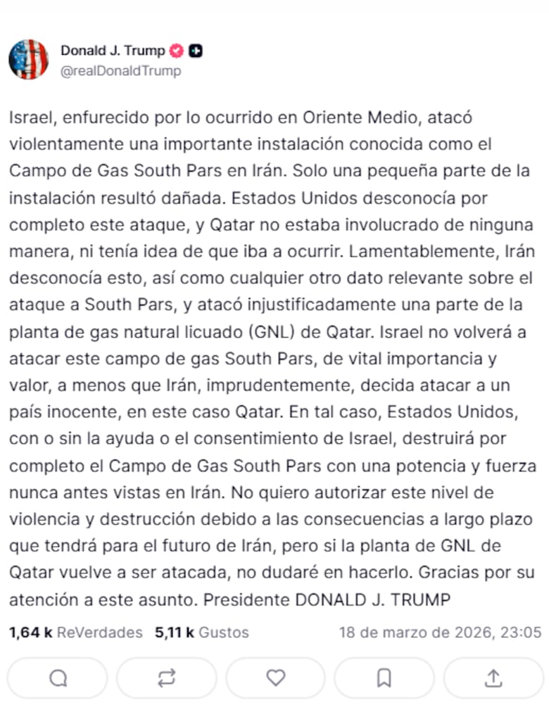 El presidente de Estados Unidos, Donald Trump, realizó un posteo en su cuenta de Truth Social en donde señaló que Washington no había sido informado del ataque que Israel llevó a cabo en la tarde del miércoles contra la planta gasífera iraní South Pars, lo que luego motivó la respuesta del régimen con dos tandas de misiles contra Ras Laffan, la mayor planta de gas natural licuado (GNL) de Qatar.